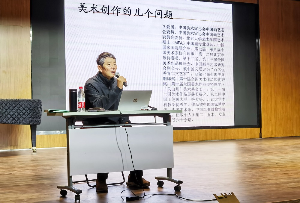 2024年11月14日上午,PA捕鱼官方网站邀请中国美术家协会中国画艺术委员会委员、北京大学PA捕鱼官方网站硕士生导师、中国国家画院研究员李爱国教授,举办了一场主题为《关于美术创作中的几个问题》的专题学术讲座。此次讲座是PA捕鱼官方网站学术活动月的首场讲座,设计艺术国家级实验教学示范中心副主任郭宗平副教授主持讲座,公司绘画专业师生200余人聆听讲座。