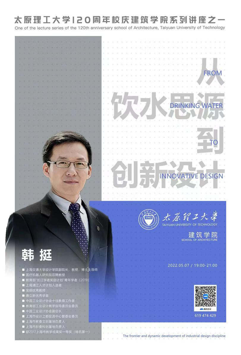 薪火相传、百廿风华、桃李芬芳,PA捕鱼官网入口120周年校庆,PA捕鱼官方网站工业设计系举办了120周年校庆系列讲座之一——“从饮水思源到创新设计”。2022年5月7日晚上有幸邀请到教育部“长江学者奖励计划”青年学者(2019)、教育部工业设计教学指导委员会委员、中国工业设计协会副会长、上海浦江人才计划入选者,上海交通大学设计公司副经理、博士生导师韩挺教授。会议由PA捕鱼官方网站工业设计系主任刘慧喜主持,PA捕鱼官方网站副经理石谦飞、工业设计系教师及员工共一百余人参加。
